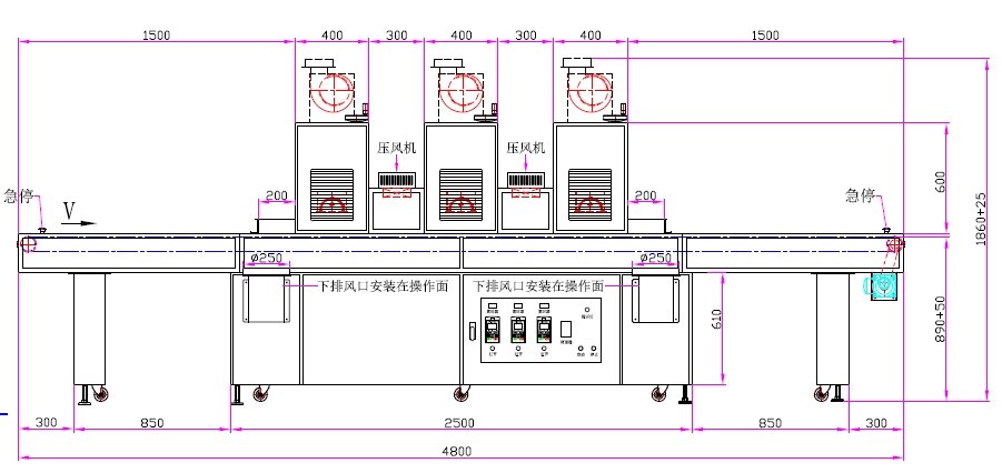 1、UV灯功率:12kw3支(UV卤素灯)
