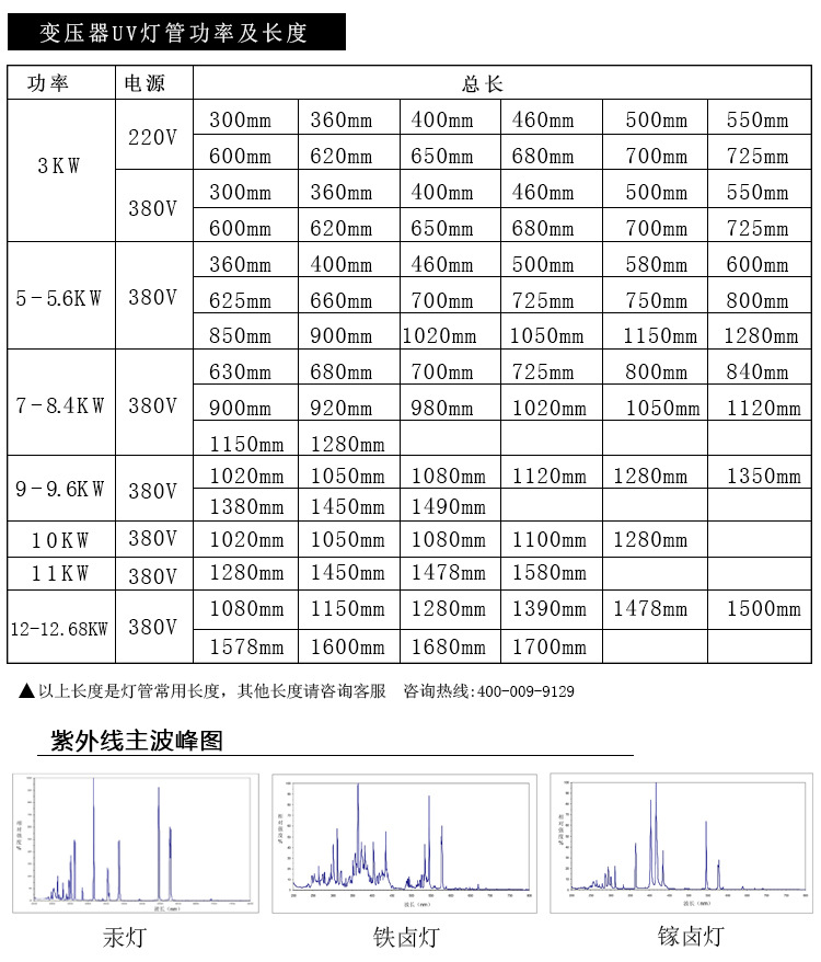 高压汞灯可以产生辐射强烈的310nm 、365nm、410nm 等波长的特征紫外光(UV)、可见光及红外光(IR)其中365nm为主峰的波长是世界各国常用的、用于固化干燥的波段(常规所称谓的"