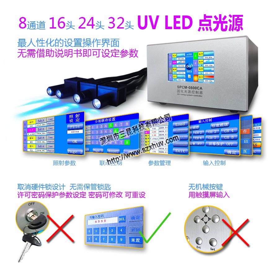 UVLED点光源控制器用专用的LED驱动IC,采用开关式恒流驱动控制,适应宽电压输入,效率高,驱动IC不需要添加散热器,控制器为全铝机箱全密封,长时间持续使用的情况下机箱内外温度都还是很低。电路设计中所有需要考虑电流通过能力的场合,都采用了高余量设计,不存在局部发热的问题,所以主机很耐用和很稳定;